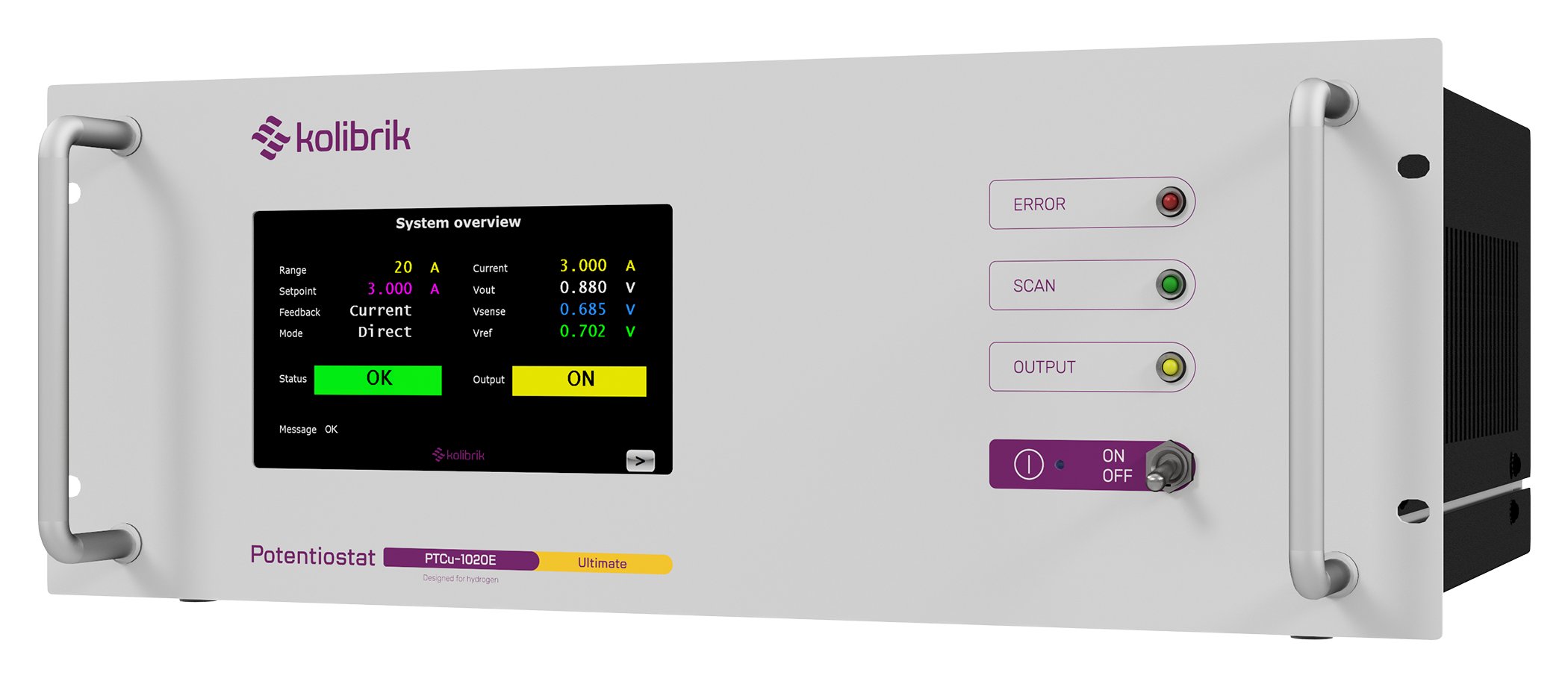 The PTCu-1020E is a highly versatile member of the Kolibrik Ultimate Line, bringing true multi-channel MegaEIS architecture to a standalone high-power potentiostat. It delivers continuous heavy-duty performance with an output voltage of -5 V to +10 V, up to ±20 A, and integrated water cooling. Engineered for advanced scale-up R&D, it eliminates measurement bottlenecks by adding 3 simultaneous measuring channels, 1.25 Msps high-speed sampling, and hardware Trigger IN/OUT to seamlessly capture rapid transient events in your most demanding testing setups.